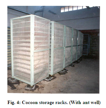 When long periods of storage are not necessary partially dried cocoons may be stored in thin layers in trays kept on wire mesh racks.  These racks may be placed in a well-ventilated room so that the cocoons are not affected by fungus due to presence of moisture (Fig.4).