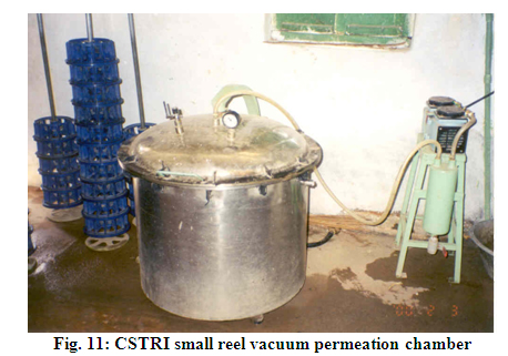 Wetting of raw silk on small reels before re-reeling is very essential for better re-reeling performance.  This process softens the gum spots between the silk threads on the small reel and facilitates smooth unwinding.  CSTRI has developed a small reel vacuum permeation chamber with capacity of 20 reels to achieve this objective (Fig. 11).