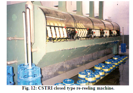 CSTRI has standardised the specifications of closed type of re-reeling machine for production of quality silk.  From the studies conducted at CSTRI following re-reeling process parameters are recommended (Fig.12).