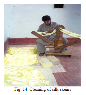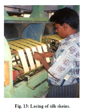 The re-reeled silk should be cleaned for gum spots and extraneous impurities gently by hand without damaging the silk threads.  During lacing, cleaning, skeining and book making extra care should be taken to avoid end breakages in the skeins (Fig.14).