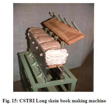 In order to popularise long skeining and long skein book making amongst reelers, CSTRI has developed a hand operated economical model long skeining and long skein book making equipment for Indian silk reeling units.  In this method long skeins are made into 5 Kg. books (Fig.15).